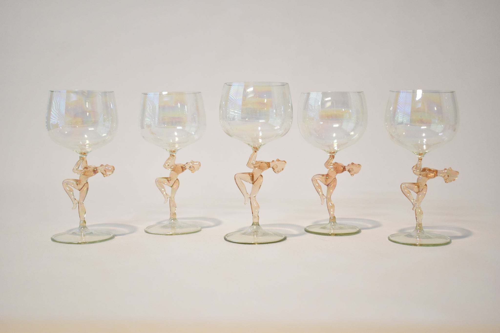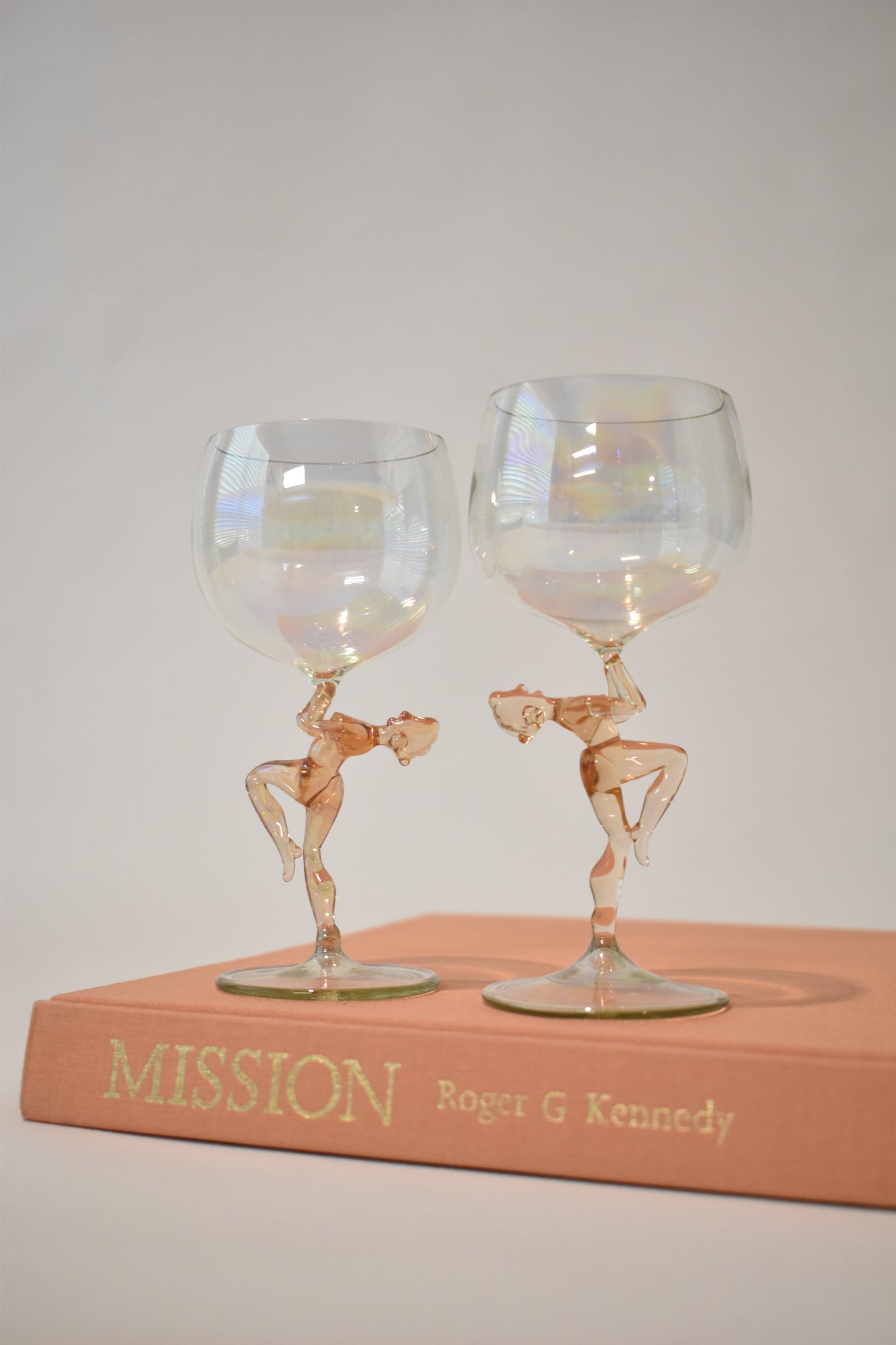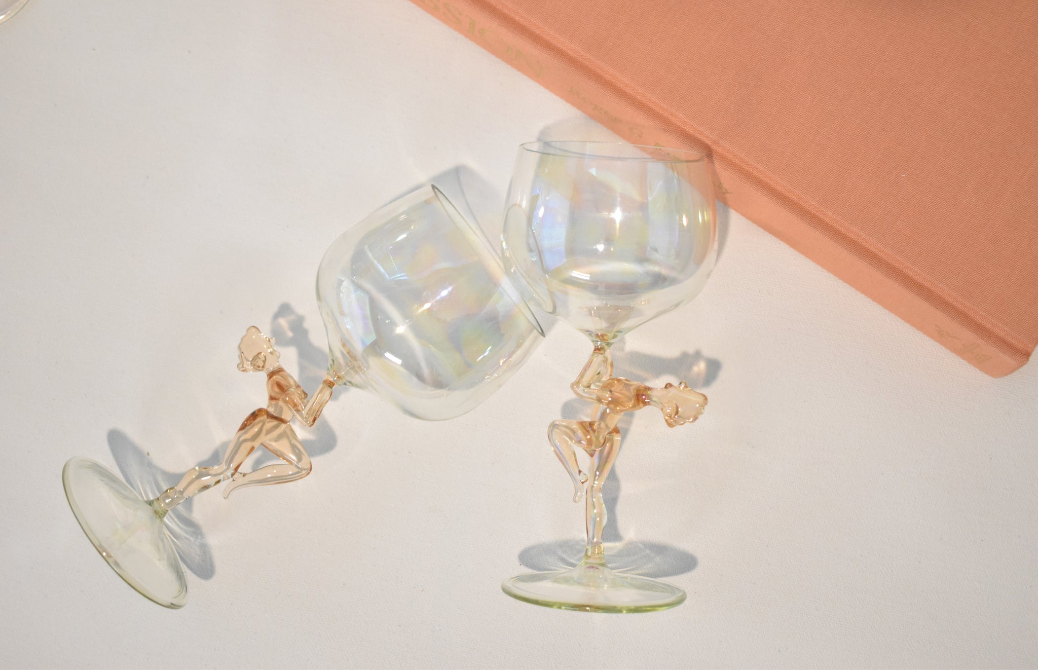 Turn every toast into a work of art with this exquisite set of iridescent glasses featuring peach nude figural stems - each one a graceful dancer frozen mid-motion. Their soft shimmer and sculptural beauty capture the essence of vintage Art Deco glamour. Perfect for collectors, elegant entertaining, or as a show-stopping display piece that adds timeless sophistication to any space.