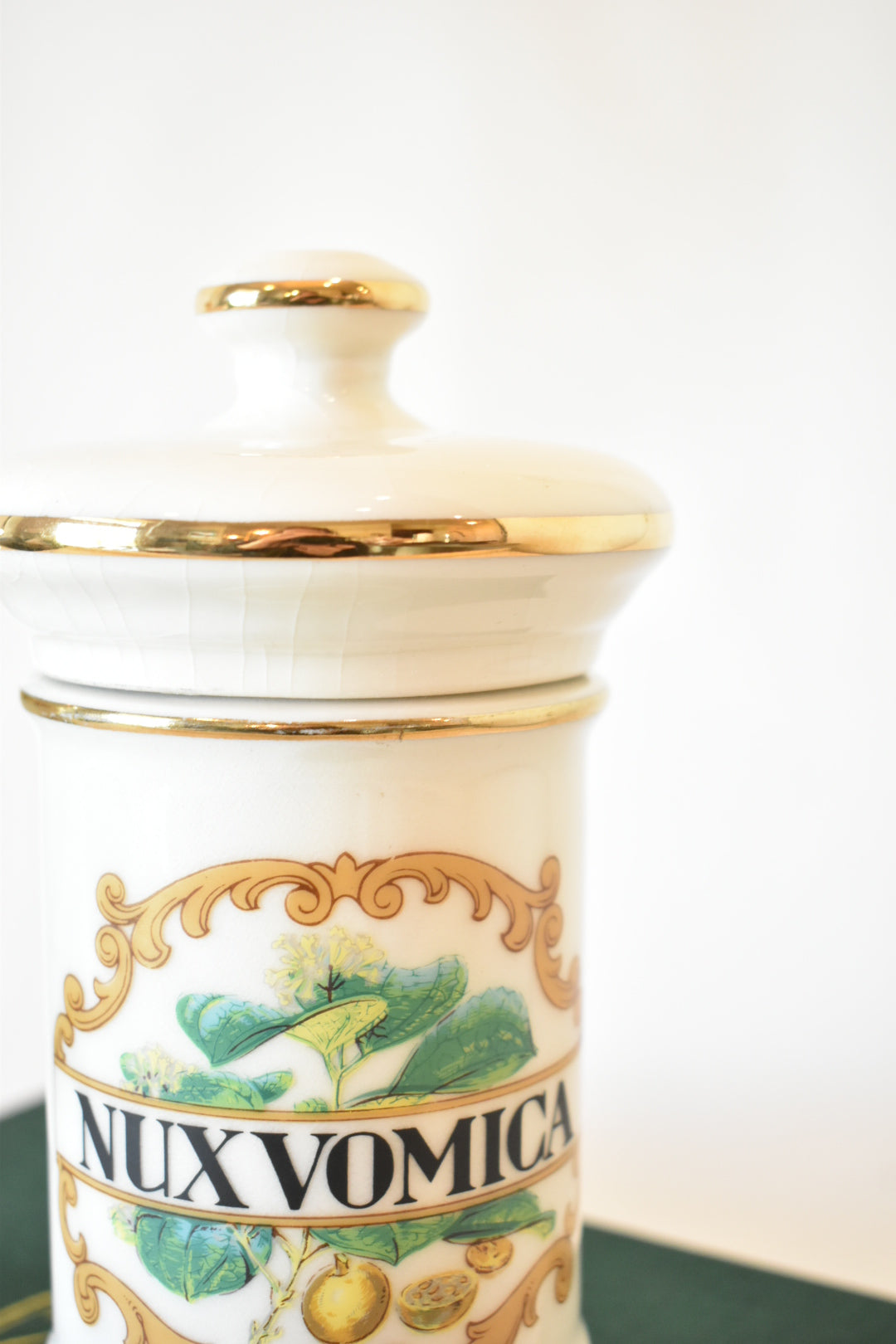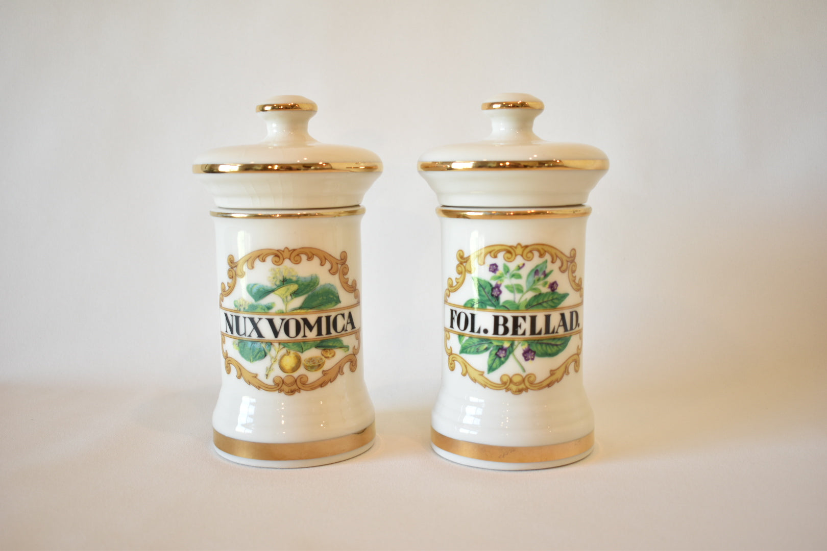 Enhance your decor with our vintage apothecary jars, featuring stunning images of Nux Vomica and Fol. Bellad on their corresponding jar. Each jar, adorned with gold detailing and a removable lid, dates back to the 1960s. These unique pieces combine charm and functionality, making them perfect for collectors or anyone looking for stylish storage!