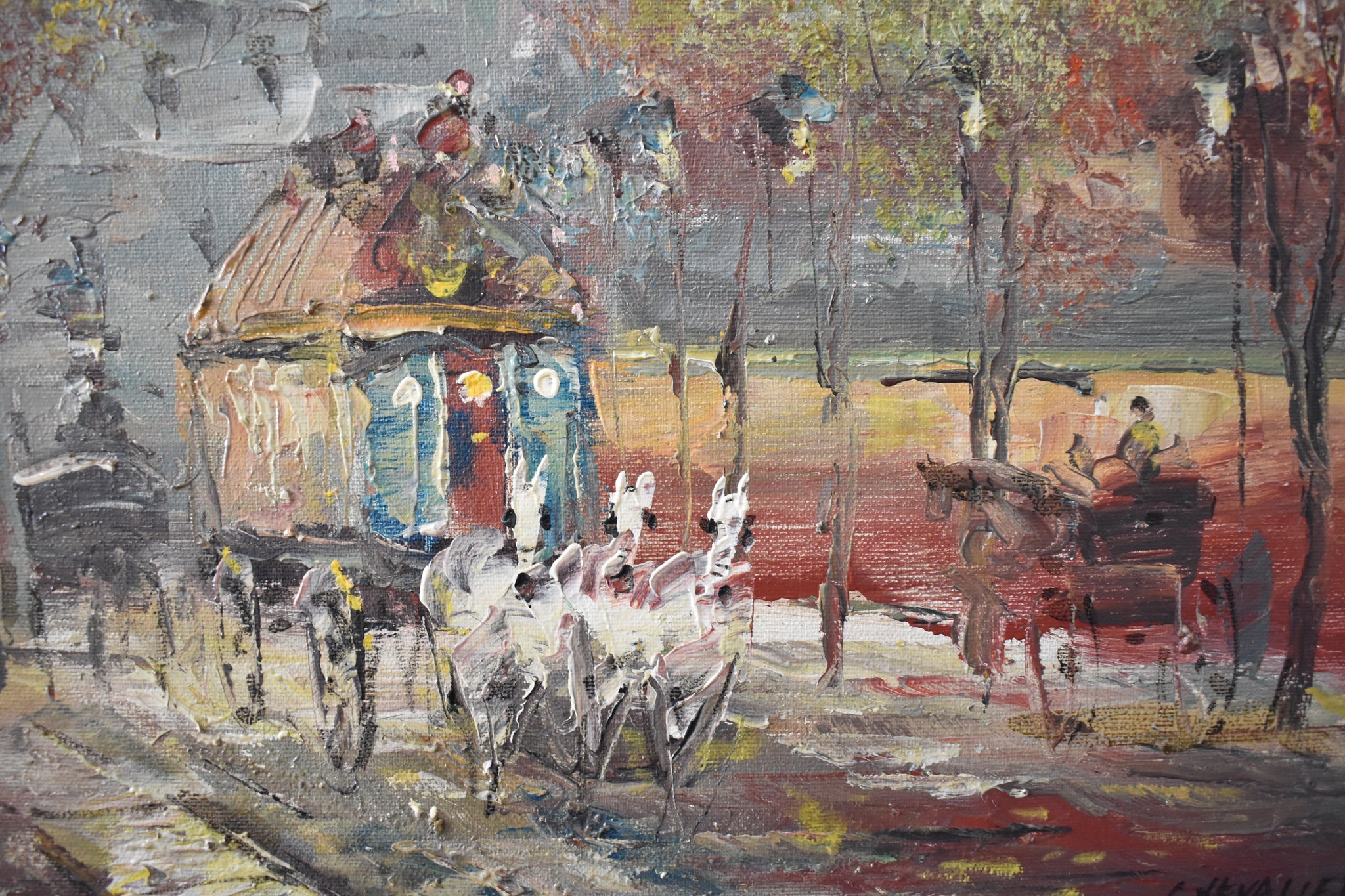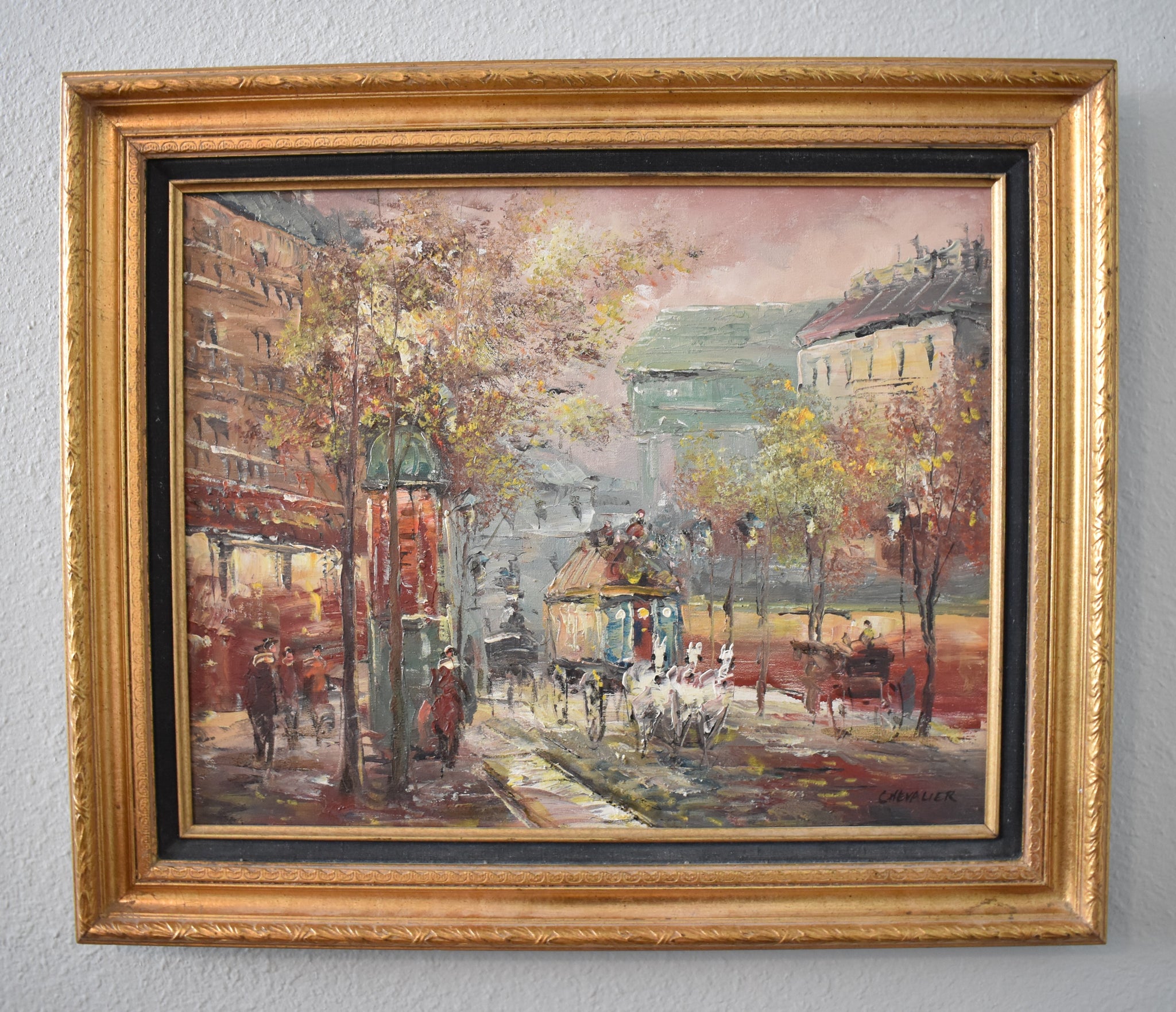 A captivating vintage oil painting signed Chevalier, depicting a lively Parisian street scene alive with color and charm. This impressionist cityscape captures the romance of Paris with softly blurred architecture, glowing lamplight, and elegantly dressed figures strolling beneath autumn trees. A horse-drawn carriage adds a nostalgic touch, drawing the viewer into the rhythm of city life from another era.